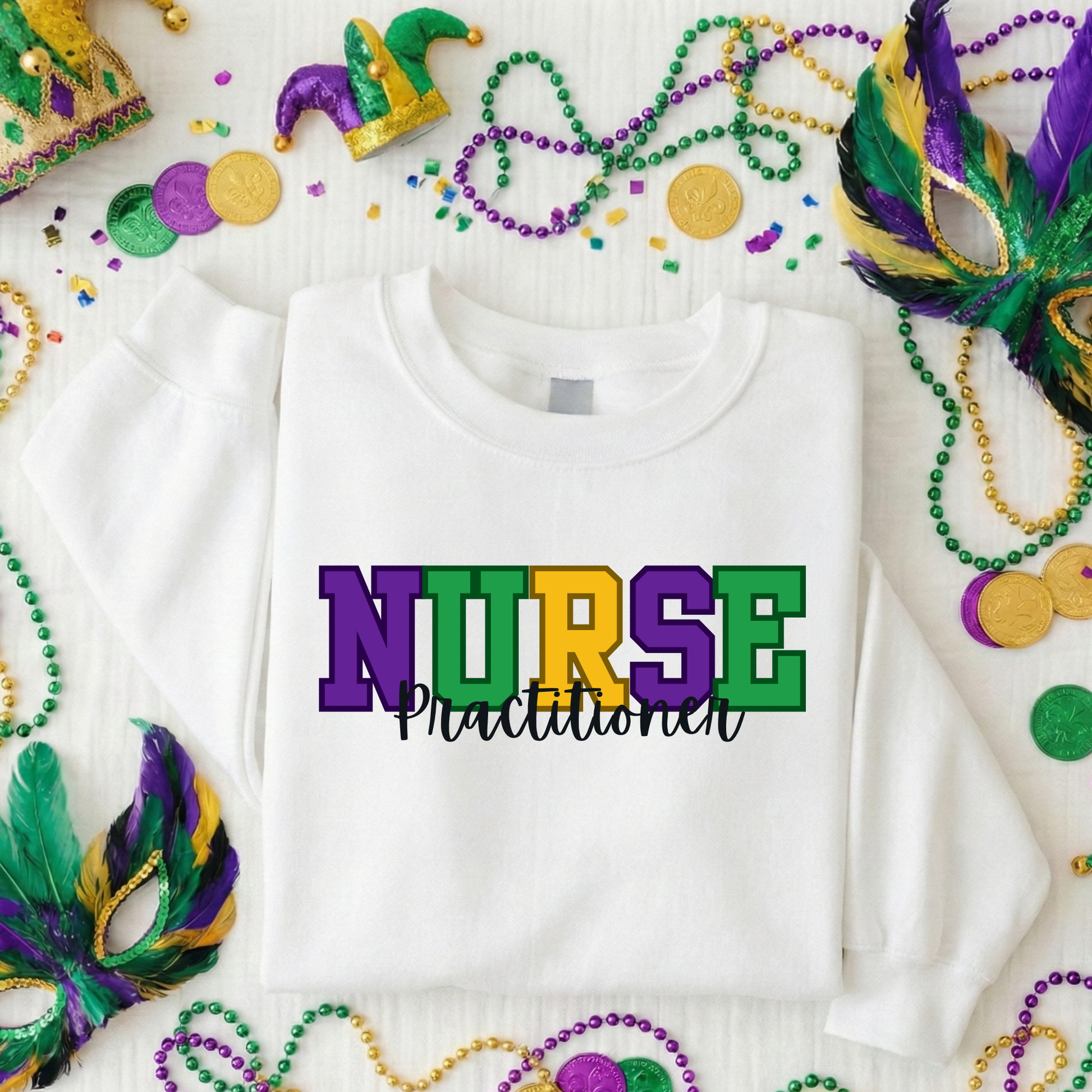 Soft, lightweight, and comfortable for long shifts or celebrations, this Mardi Gras Design pairs easily with scrubs or jeans.